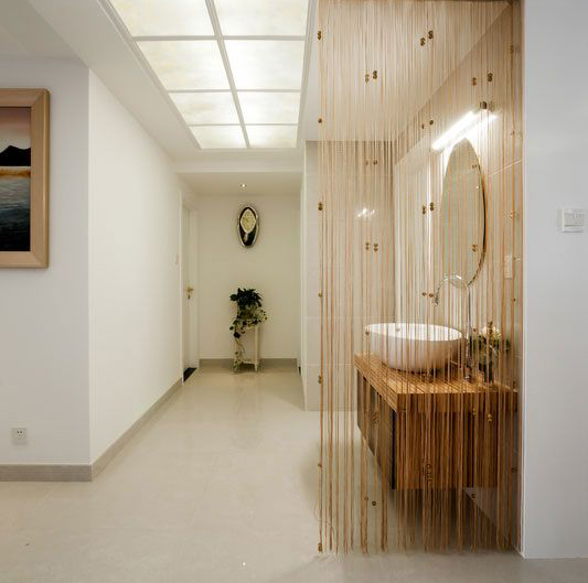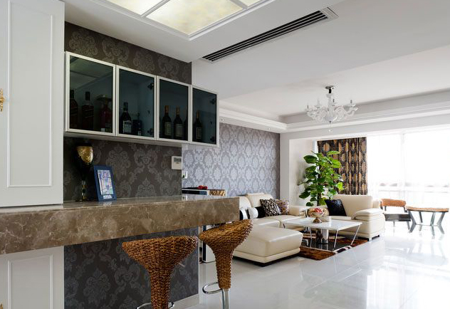 接觸本案業主蓮MM是通過原來客戶介紹認識的,她家的設計很特殊,我接手下來的時候她都已經準備開始做木作的。從和她的溝通中知道她偏喜歡的風格趨向是現代簡約,但是她已經定好的家具確是比較中性的皮質沙發和比較厚重的木制石材臺面的歐式餐桌,她個人是不太喜歡復雜并厚重的歐式風格,所以在最后的風格定位上確定了現代簡歐的風格去銜接不是很互搭的兩種家具。而對于原有的空間的規劃上也做了稍微的調整,在客廳和餐廳的過渡區域增添了吧臺的區域,既恰當的利用上空間的基礎上又使空間顯得飽和。而吧臺的區域和鞋柜的區域也很完整的銜接在一起。而整體的色調上還是以白色為主,在軟裝的配飾上以灰色、咖啡色、褐色、土黃色去映襯,使得空間和諧統一。