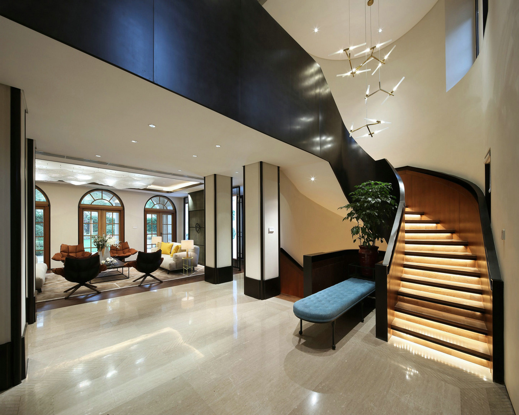 整個戶型格局為兩層帶地下室。風格定位為新都市現代風格。適合現代生活需求的同時,向傳統審美致敬。藍色算是塑造寧靜感覺的更佳色彩,在以白色為背景的硬裝里,黃昏藍和氣質米的現代沙發讓空間冷靜、沉穩。沙色的地毯適度地緩解了空間高冷氣息,另外點綴色選用了嬰兒黃,提亮空間,引人注意之外,也增加了空間的層次感。適量的皮革搭配,讓現代里又帶上了一絲不一樣的質感。用材質和顏色的混搭來區分空間的功能性以及不同年齡客戶的生活需求。這里有沙色的土壤,洗凈的藍天,平靜的大海,每天睜開眼你都是快樂的。